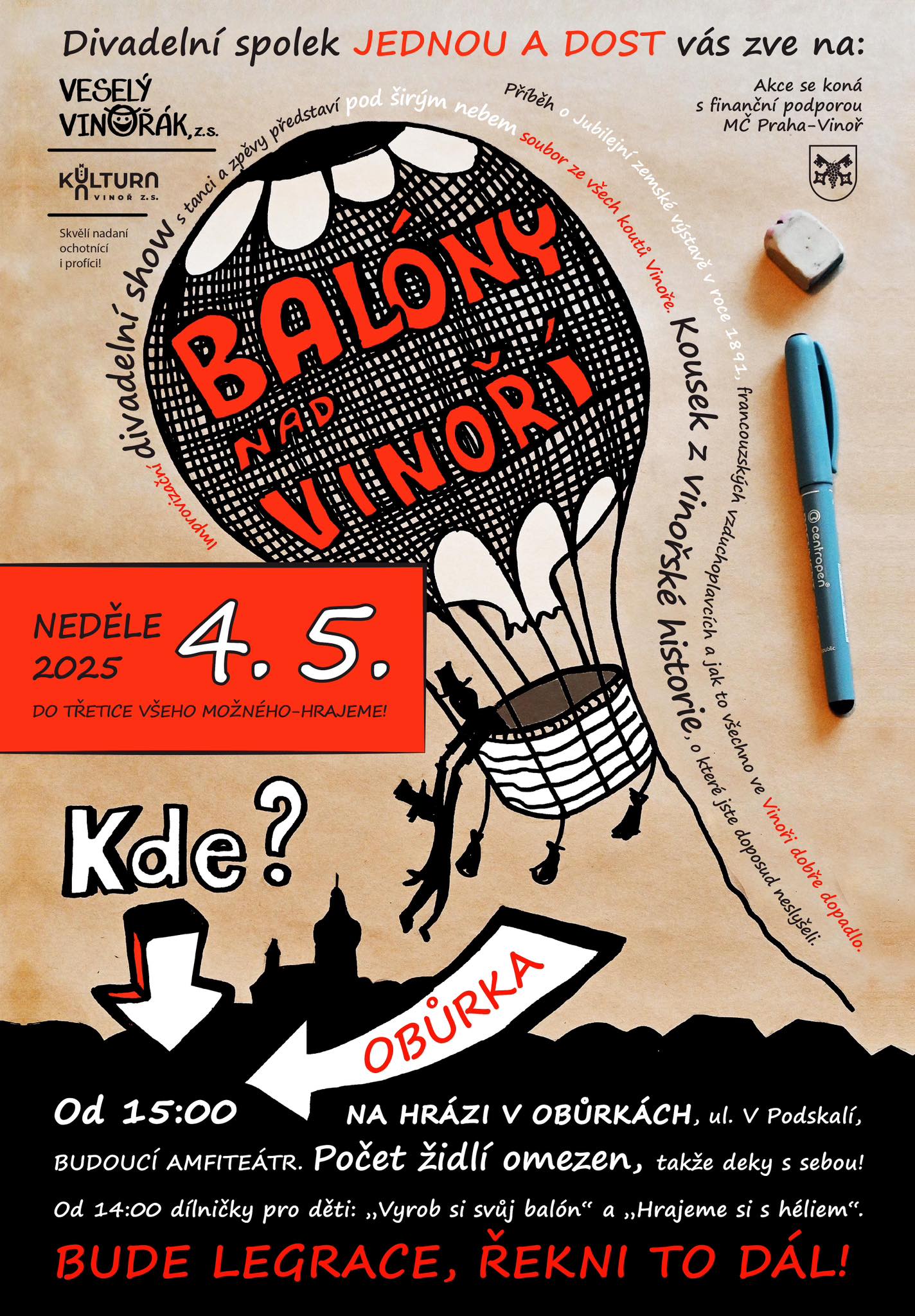 Od 15:00 v improvizovaném divadelním amfiteátru na hrázi rybníků v Obůrkách. Divadelní soubor JEDNOU A DOST si vás dovoluje pozvat na neopakovatelnou improvizační divadelní show o doposud neznámém příběhu z vinořské historie. Příběh z roku 1891 o Jubilejní zemské výstavě, francouzských vzduchoplavcích a jak to všechno ve Vinoři dobře dopadlo. Počet židlí omezen, deky a děti s sebou – od 14:00 otevíráme nejenom dětské dílničky s balóny a héliem. Sledujte vývěsní plochy a sociální sítě; židle můžete rezervovat na adrese: vesely.vinorak@gmail.com. Neváhejte! Uvidíte, co jste ještě neviděli!