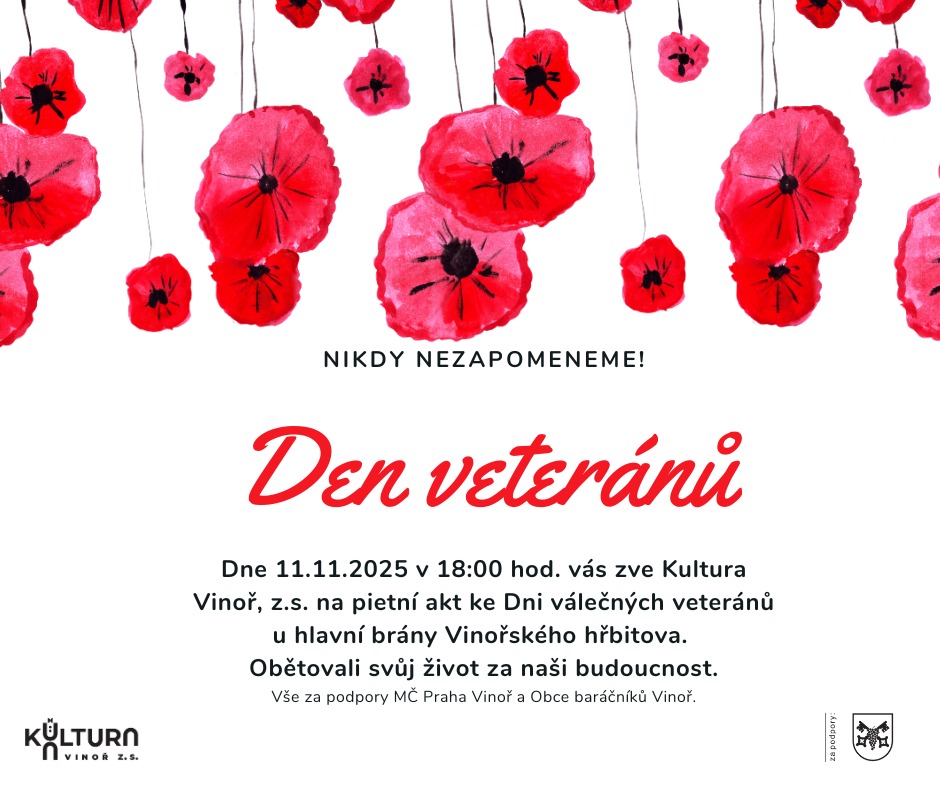 MČ Praha Vinoř, Kultura Vinoř a Obec baráčníků Vinoř si Vás dovolují pozvat na pietní akt při příležitosti dne Válečných veteránů. Koná se 11. listopadu od 18 hodin u pomníku padlých před hřbitovem ve Vinoři.