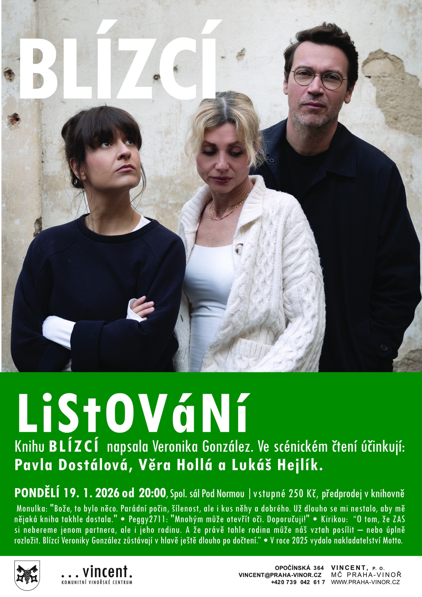 Pondělí 19. 1. 2026 od 20:00, Společnský sál Pod Normou, vstupné 250 kč, předprodej v knihovně (Opočínská 364)