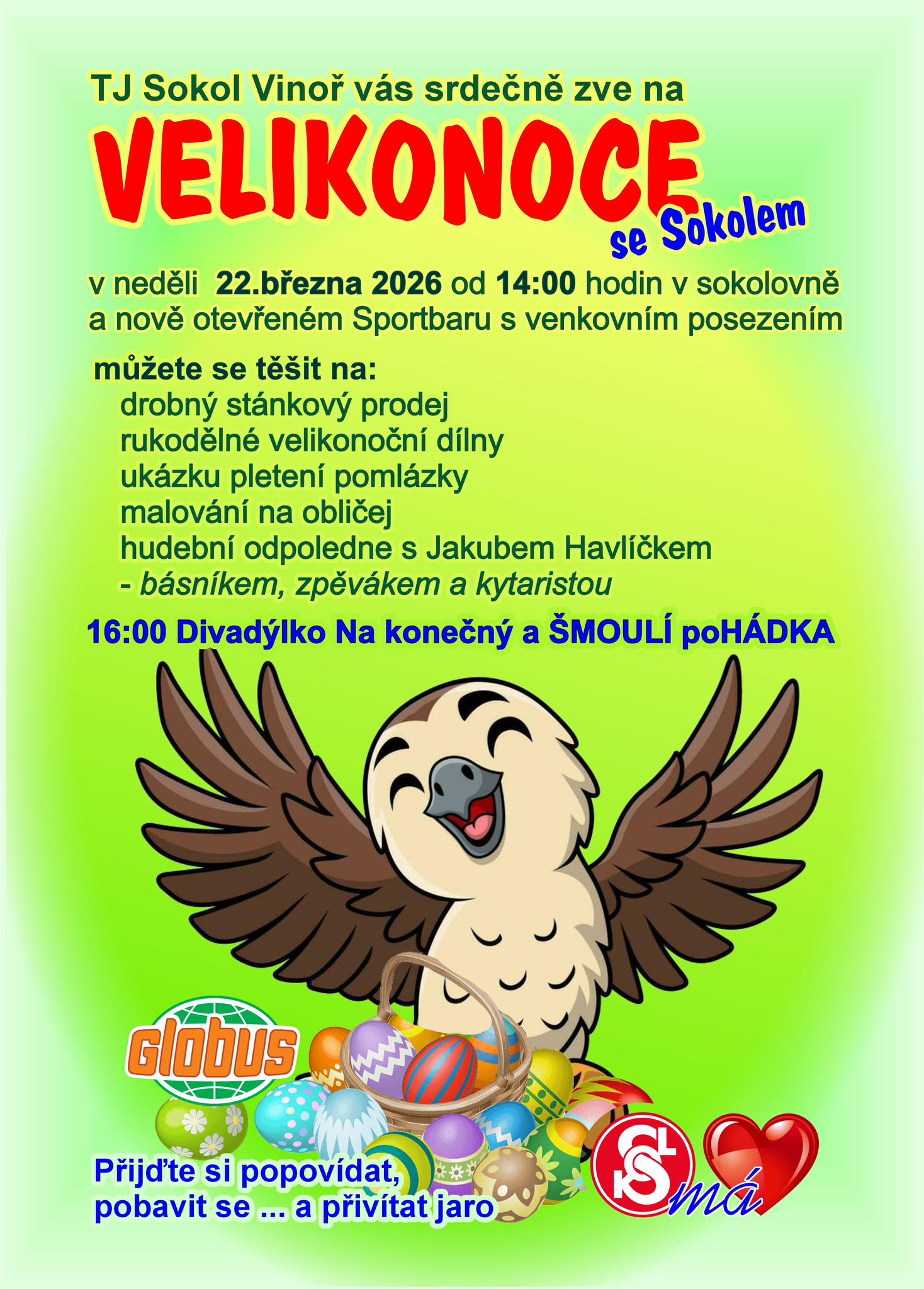 Od 14 hodin – sokolovna pohádka, dílničky, obyčeje (pletení pomlázky), stánky.