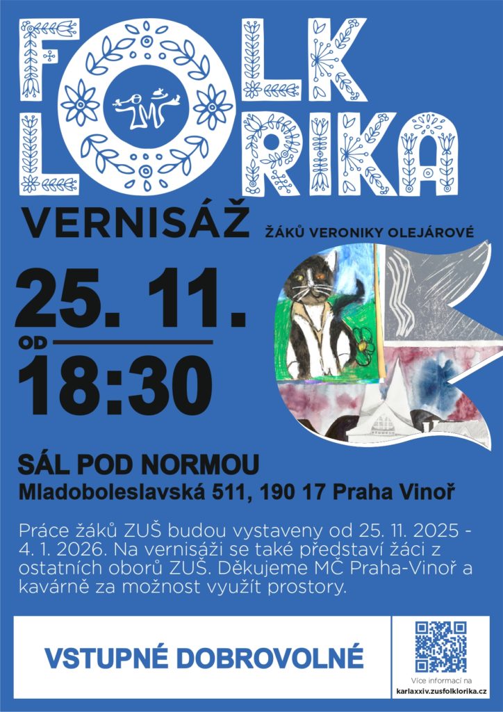Vernisáž prací výtvarného oboru žáků výtvarného oboru vedeného paní učitelkou ZUŠ BcA. Veronikou Olejárovou z místa poskytovaného vzdělávání ZŠ Vinoř, Prachovická 340, 190 170 Praha Vinoř se uskuteční v úterý 25. 11. 2025 od 18:30 v Sále Pod Normou, Mladoboleslavská 511, 190 17 Praha Vinoř.
