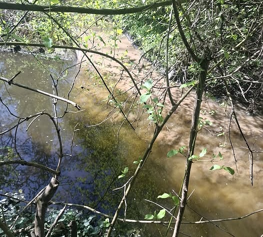 Pan Hřebec v pátek odpoledne dal na Facebook fotku, jak se do Vinořského potoka valí kalná voda z jeho přítoku. Ne každý to z fotky hned vidí, z horní části přitéká do Vinořského potoka hnědá břečka.