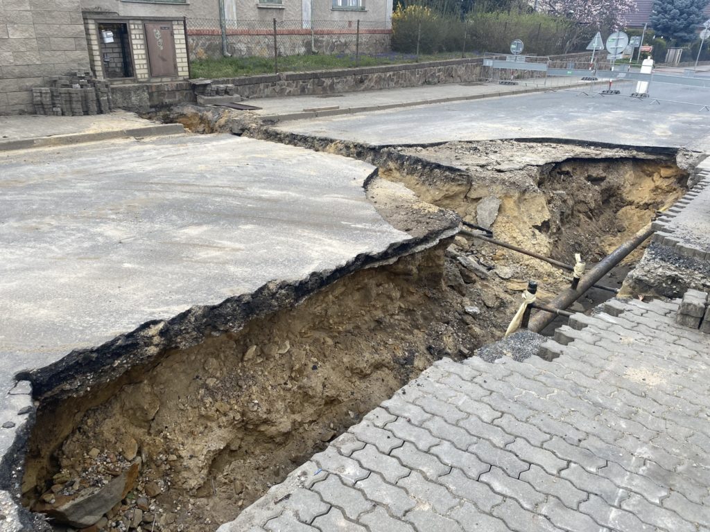 P.S.: Na obrázku je vidět „příčný řez“ dnešní vozovkou … fotka z roku 2023, kdy byla havárie plynovodu. Vidíte, že leží šlupička asfaltu na hlíně. Není zde žádný pevný podklad, a proto ta ulice vypadá tak, jak vypadá…