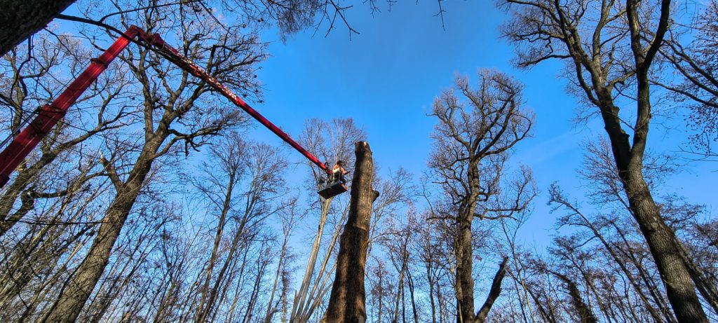 Dnes byla koruna stromu sesazena. Kmen se odřezával na několikrát, až zůstalo cca 4 metry vysoké torzo, které je pro teď stabilní a bezpečné.