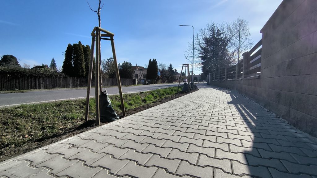 Na Bohdanečské ulici, v úseku od zastávky k fotbalovému hřišti, jsme doplnili stávající alej o devět nových sakur. Chodník v tomto úseku je již hotový – stromy ho teď pěkně doladí. Na pár místech sice terén výsadbu neumožnil, ale tam, kde to šlo, sakury jsou.